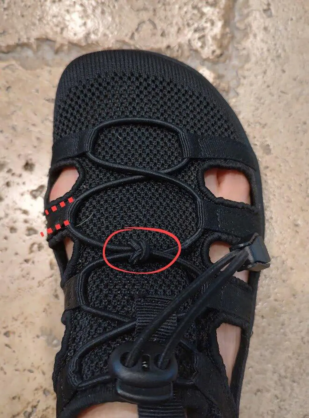 The mesh part of the shoe has a bit of stretch, but the straps sewn onto the mesh to hold the laces do not stretch. Using a seam ripper, I unpicked the stitching along the sides of the strap where my bunion is (see dotted line in photo) leaving the strap attached only to the sole of the shoe. Then I put a square knot after the second set of lace loops from the top, leaving a lot of slack in the lacing over the toe area. Tightening up the shoes now only pulls the laces tight around the ankle opening, and leaves the toebox nice and roomy. Coincidentally, my husband has the same issue and we did the same modification on his sandal. Both of us are very satisfied.